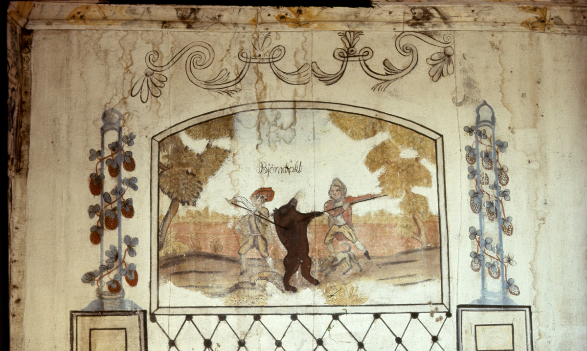 Väggmålning. Avbildad "björnjakt". En jakhund samt två personer som motar en björn med spjut.