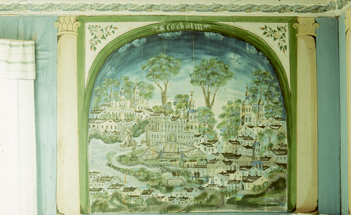 Väggmålning "Stockholm". Stadsbild med byggnader och natur.