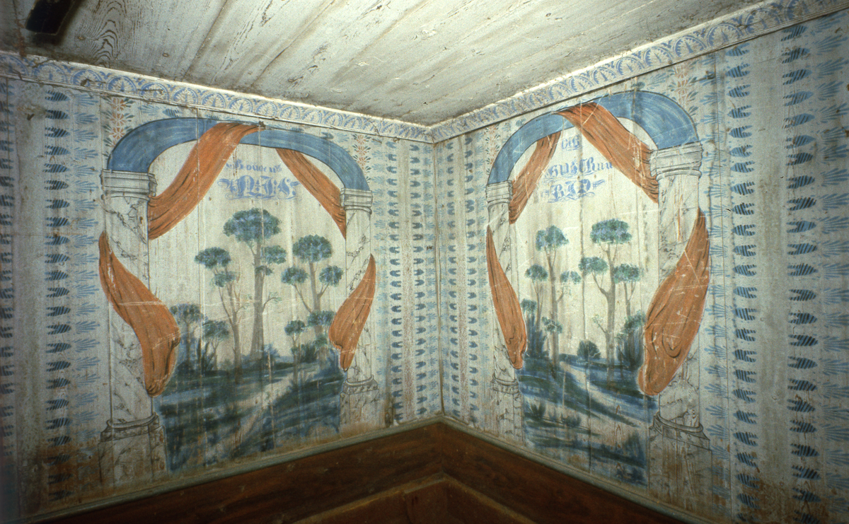Väggmålning i s.k. Farmorsstugan, Pallars. "bonden NJS och hustrun BJD".