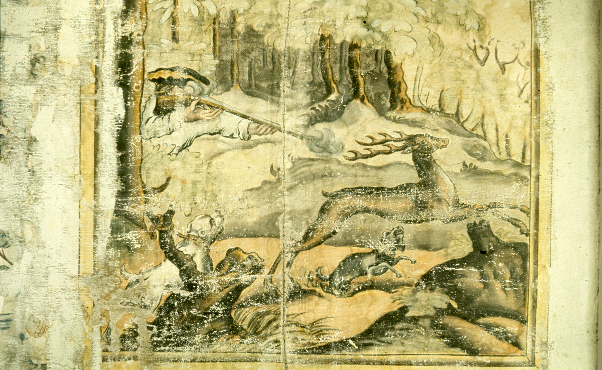 Väggmålning, naturscen med jaktmotiv. Jägare till vänster siktar efter en hjort.