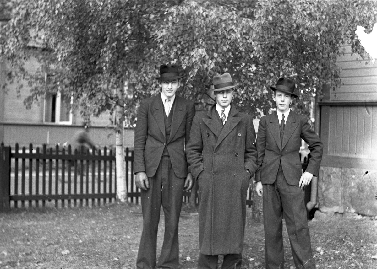 Tre unga män i trädgård