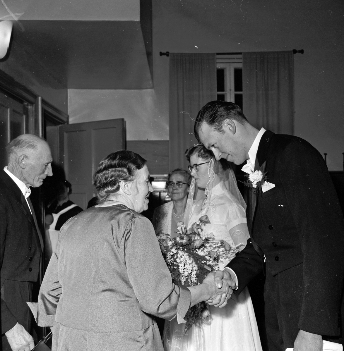 Bröllopsmiddag, brudparet hälsar på bröllopsgäster