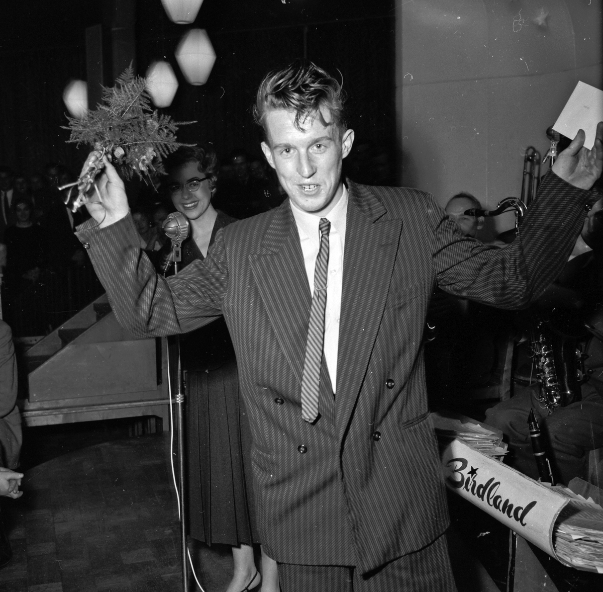 Modevisning i varuhus, en man på scenen med en liten bukett blommor och blad