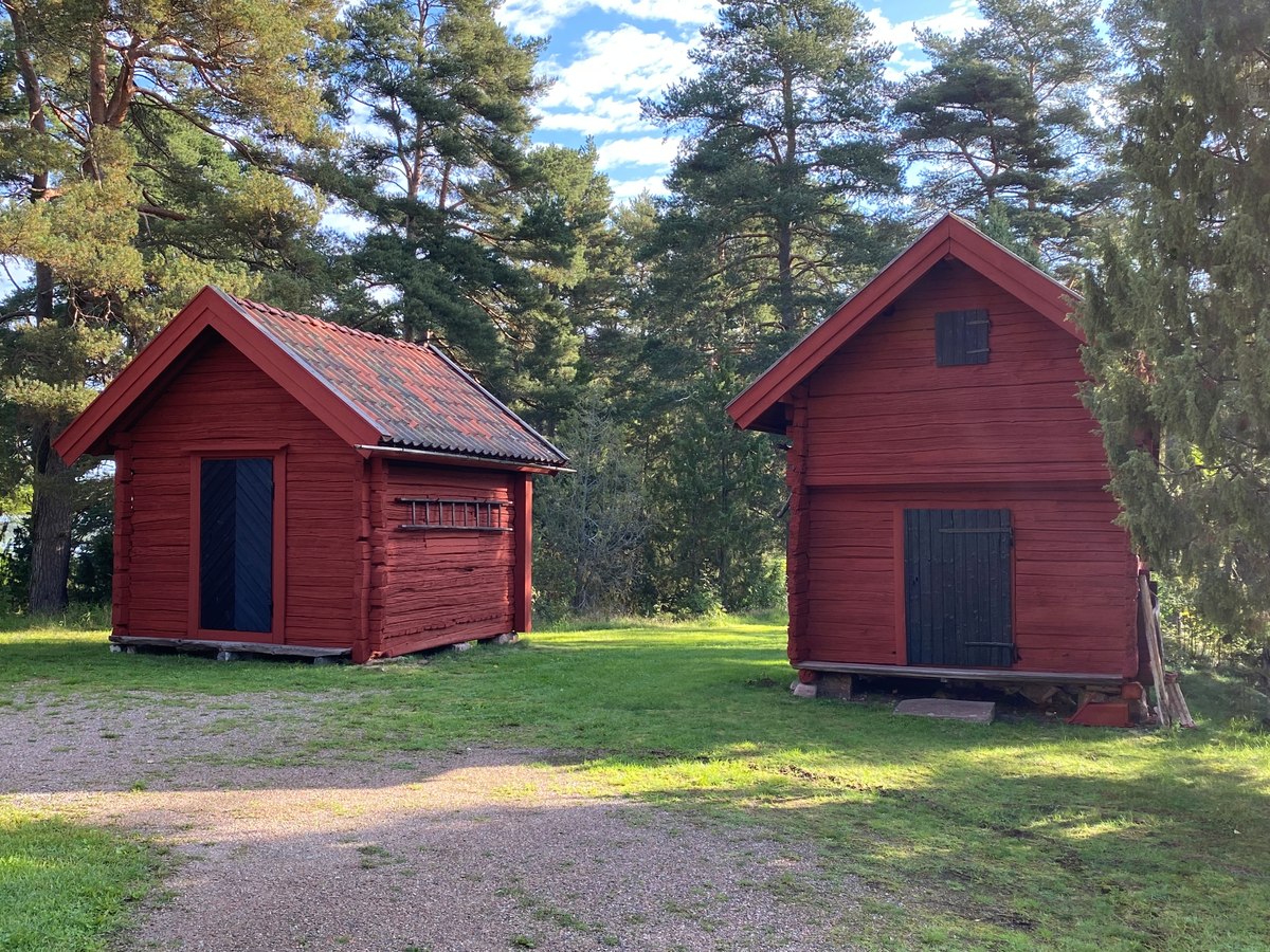 Härbren, rödfärgat timmer, lertegel, brädportar.
