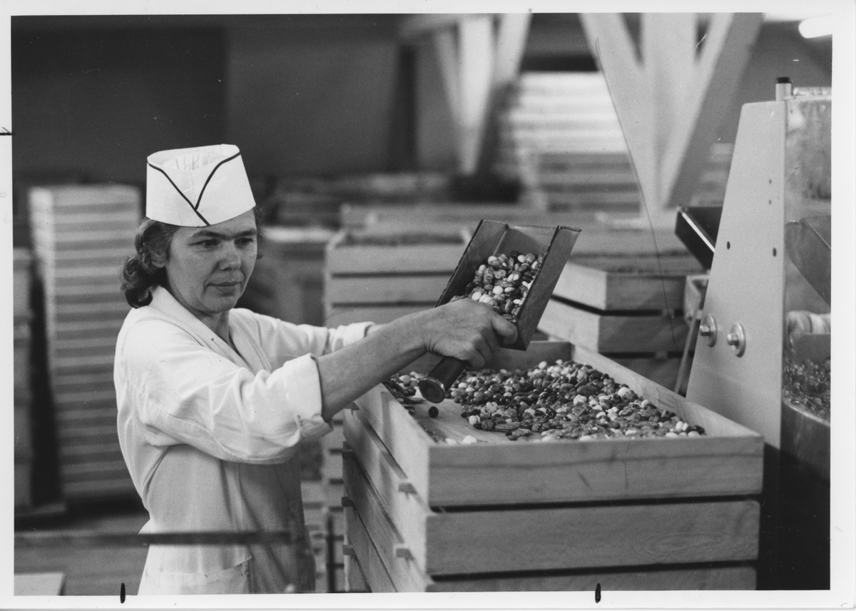 Mångrus vägs. Mångrus var en misslyckad produktion som dragérades och fick lite lakritsstänk. Verkligt gott och det blev en efterfrågan som var större än tillgången.