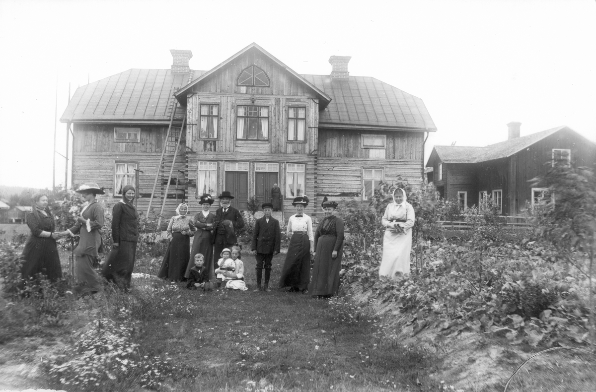 Skinnars, Lenninge 6:14. Byggnaden till höger bortriven på 40-talet. Tredje kvinnan från höger är Brita Persson, längst till höger Marta Hansson. I mitten med skärmmössa Evert Svedlund.