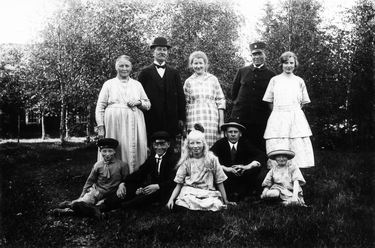 Stående från vänster: Anna Vestberg (piga i Skinnars), okänd, fru Berta Jansson, Tyko Jansson (kusk på herrgården), dottern Brita (gift Viström). Sittande från vänster: Bengt, Martin och Dagmar Jansson, Verner Hall och Margit Jansson.