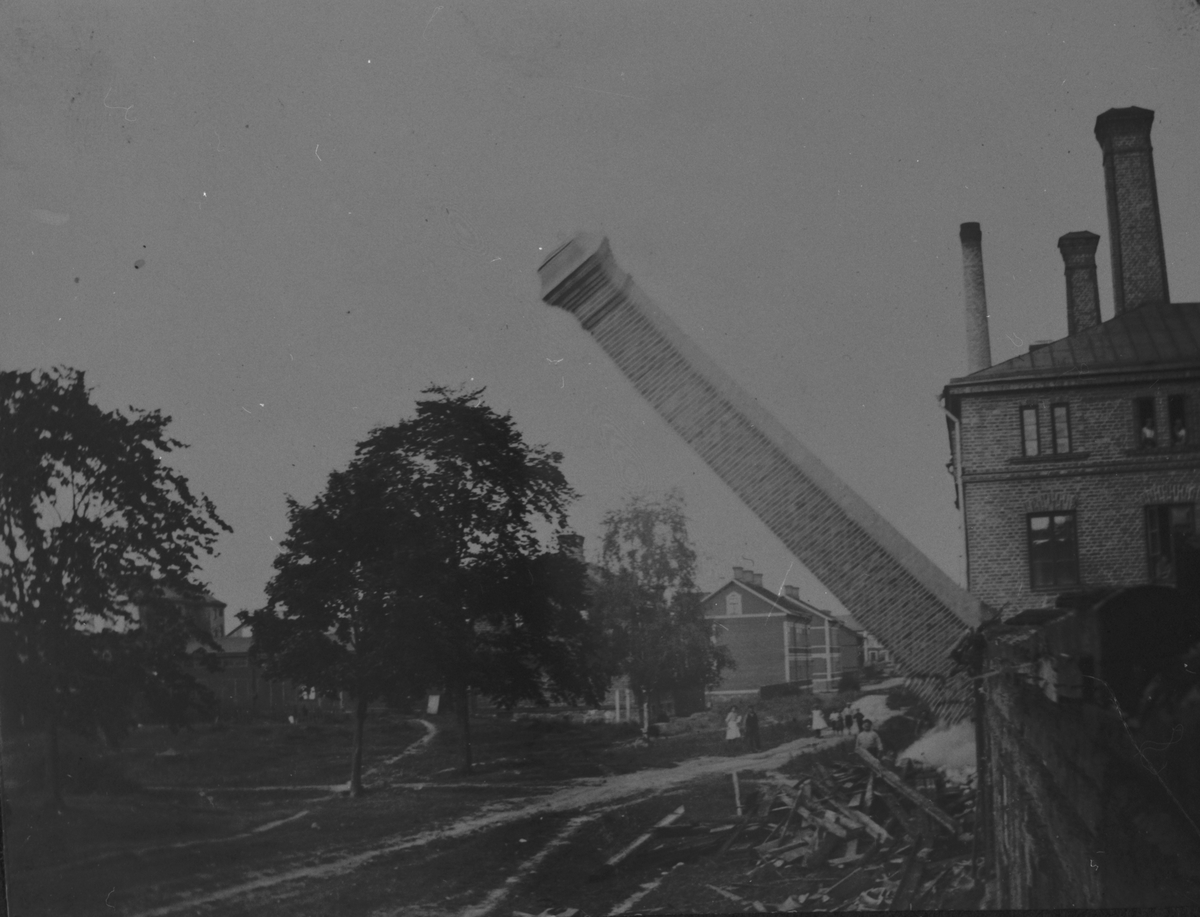 Den äldsta delen av fabriken (skorstenen underminerad för rasering.)