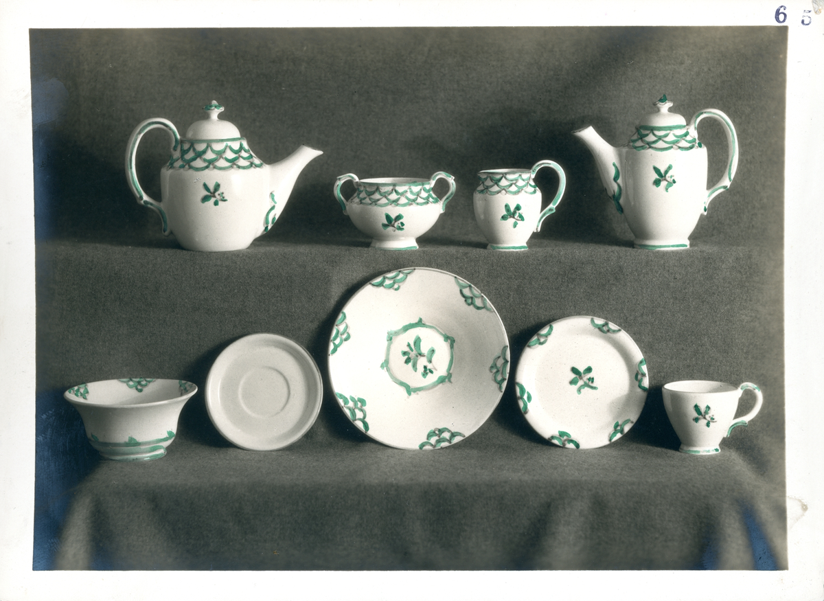 Teservis från Bo Fajans, tidigt 1900-tal. Tekannor, skålar, koppar och fat. På bilden har dekoren ritats i med en grön penna.