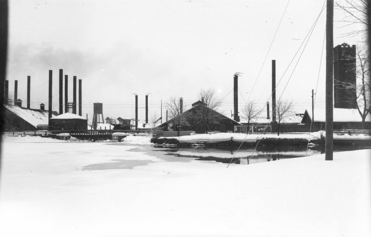 Från vänster glödgugnshus, lyshus, rörvalsverk, slangtornet.