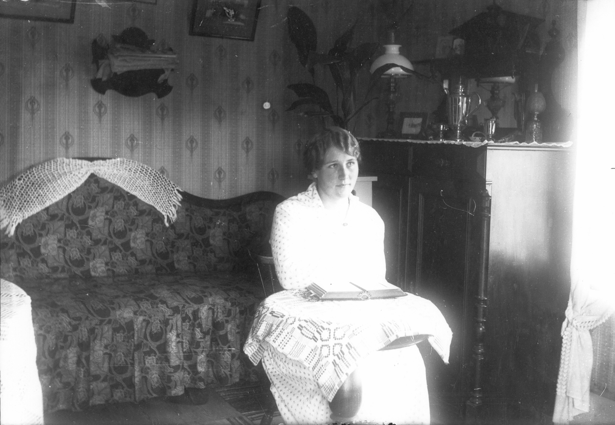 Rumsinteriör med okänd kvinna.