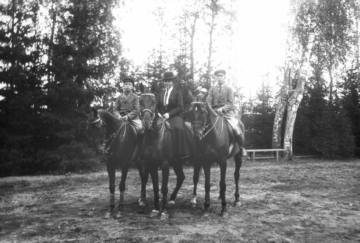 Fru Bellander till häst med sina söner, Sixten född 1903 och Curt född 1904. Foto i september 1918.