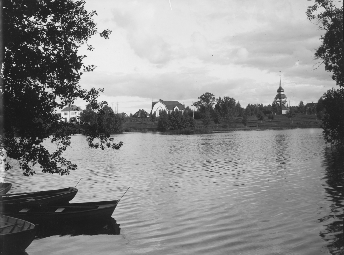 Utsikt från stadsträdgården mot regementets soldatshem och klockstapeln.