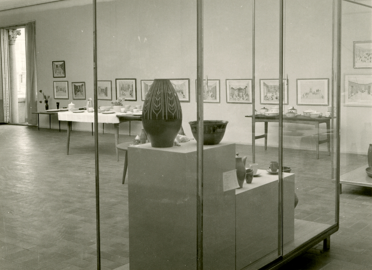 Utställningshallen med keramik från Bo Fajans, Gefle Museum 24/4 - 4/5 1956. På väggen hänger tavlor av Josabeth Sjöberg.