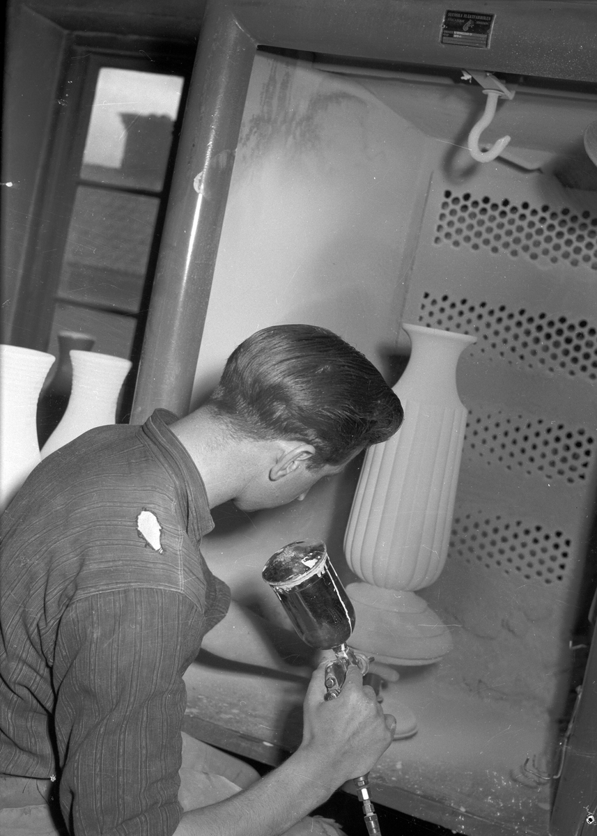 Boberg Fajans 1874 - 1949, 75 års jubileium. Från tillverkning av produkten. Firas med utställning på Gävle museum.