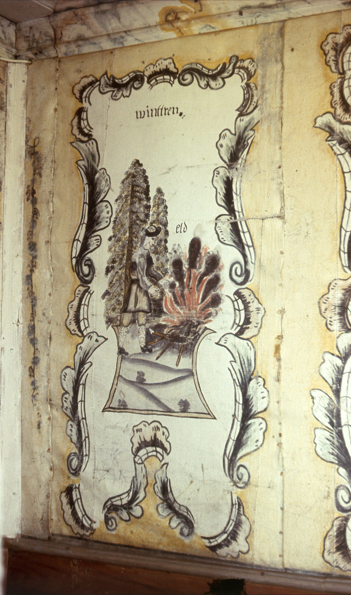Väggmålning "Vintern". En man ute i naturen värmer sina händer mot en eld.