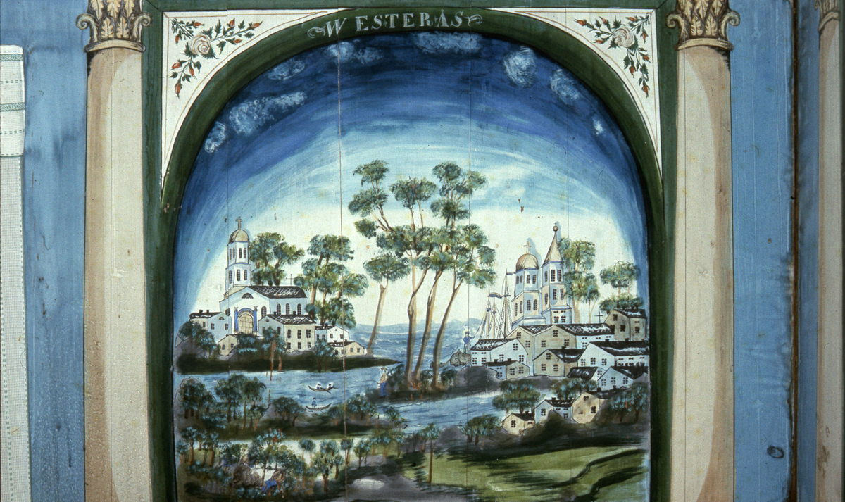 Väggmålning "Westerås". Stadsbild med mycket vatten och natur.