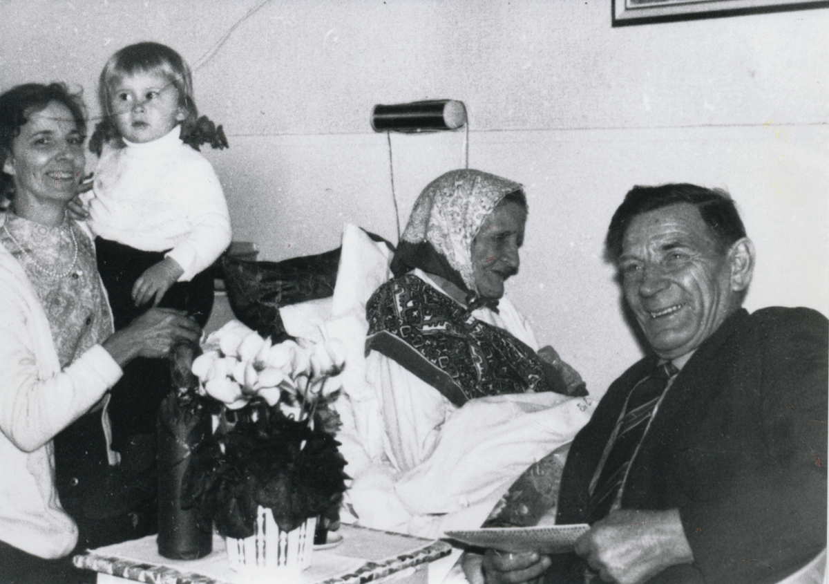 Mormors 95-årsdag. Från vänster Greta Cecilia Westberg med sonen Lars Göran, Anna Greta Westberg och Bror Westberg. Barnet på bilden är Greta Cicilia Westbergs barnbarn Lars Peter Westberg.