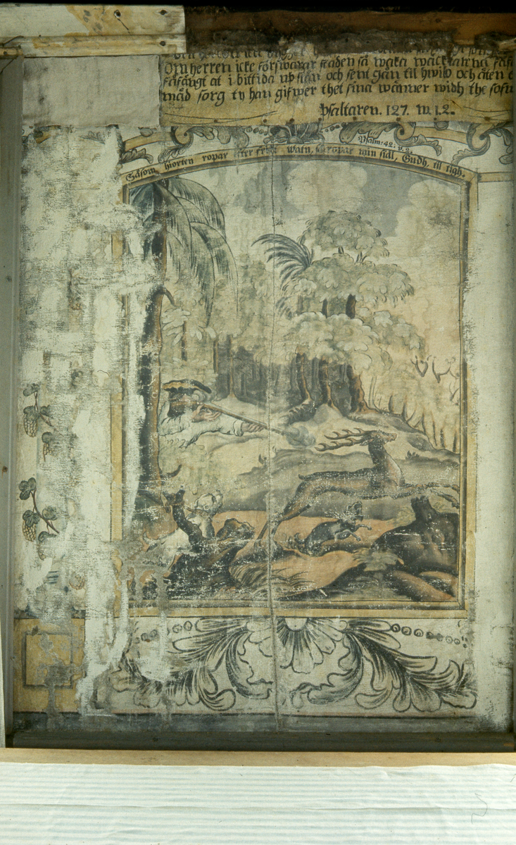 Väggmålning, naturscen med jaktmotiv. Jägare till vänster siktar efter en hjort. "Såsom hjorten ropar efter friskt watn...." "Psalm. 42. v2."