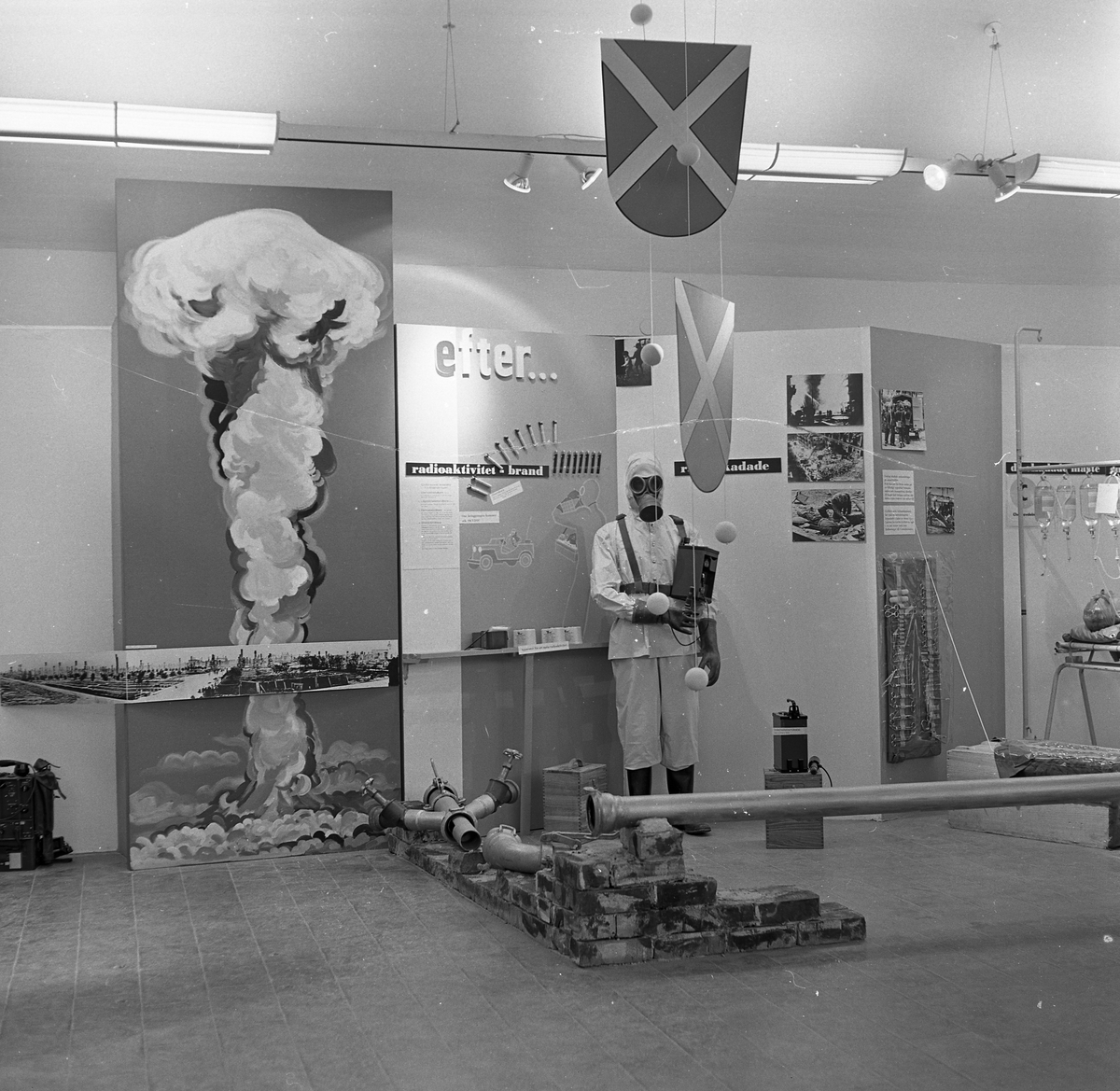 Utställning från Civilförsvaret Gävle, en skyltdocka iklädd strålskyddsutrustning och information om radioaktivbrand