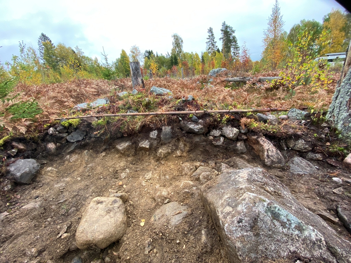 Det snittade röjningsröset inom röjningsröseområdet L2023:398, fotat mot östnordöst. Från arkeologisk förundersökning i Norra Åbyggeby i Hille socken, Gävle kommun. L1948:7210, L1951:3532, L2023:398, L2023:400 & L2023:401.