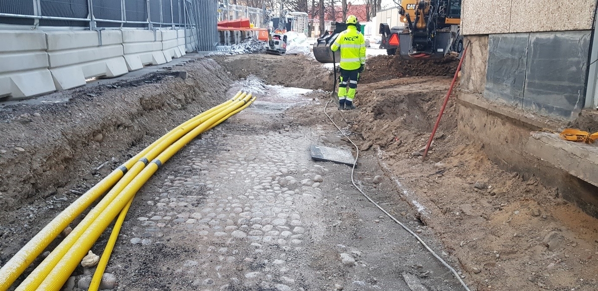 Framrensad kullerstensgata i undersökt schakt. Från arkeologisk undersökning i form schaktningsövervakning vid Stadsbiblioteket, Gävle stad och kommun. Foto mot väster. L1951:5633.