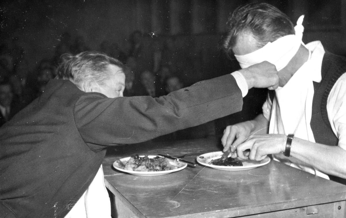 Lek med mat. Bilden ingår i ett fotoalbum.