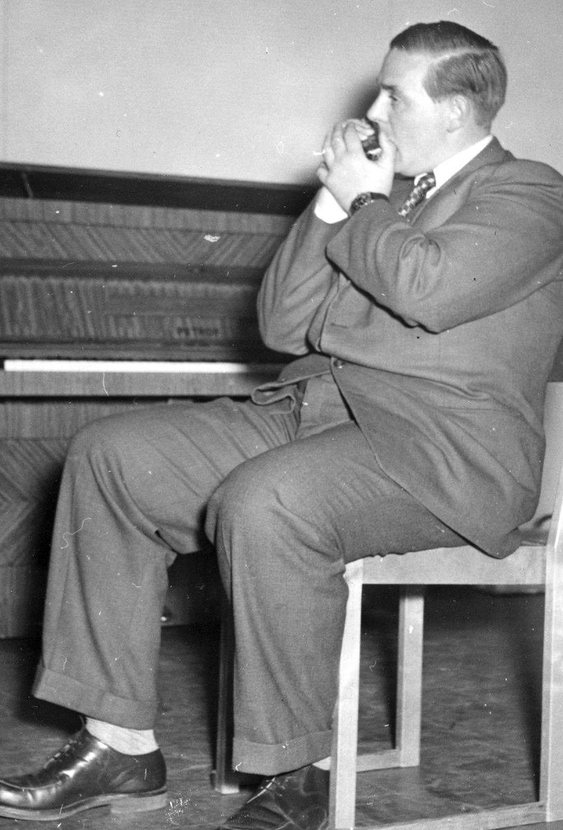 Man vid pianot spelande på sitt munspel. Bilden ingår i ett fotoalbum.