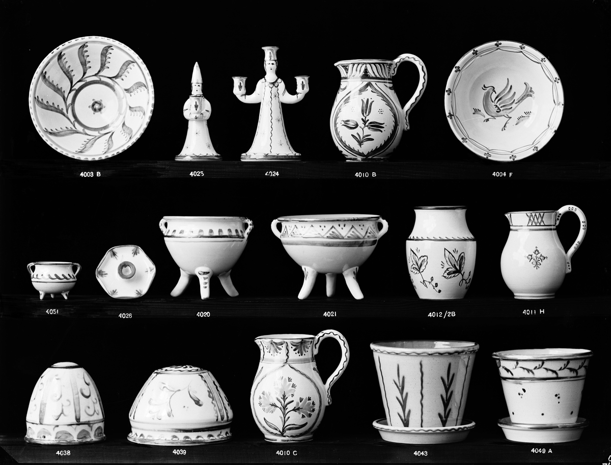 Bo Fajans. Bobergs Fajansfabrik AB. Numrerade föremål:4003 B, 4004 F, 4010 B-C, 4011 H, 4012 2B, 4021, 4024, 4025, 4026, 4038, 4039, 4043, 4049 A, 4051.