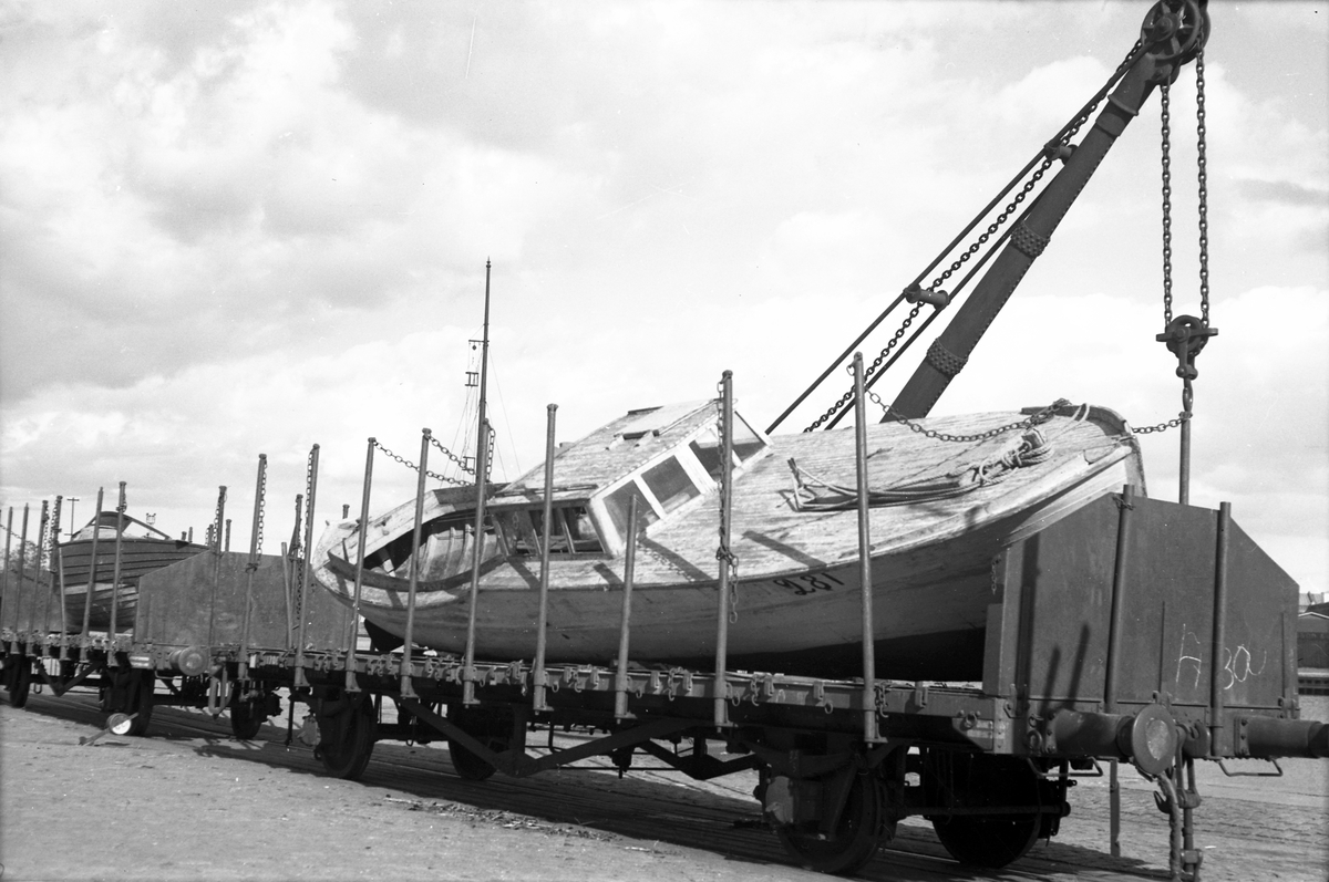 Titel: Båt på järnvägsvagn vid Tullhuset.