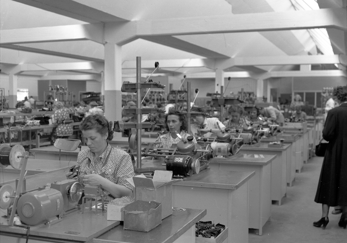 Agas nya fabrik, vid pressvisningen interiört och exteriört. Juli 1950.