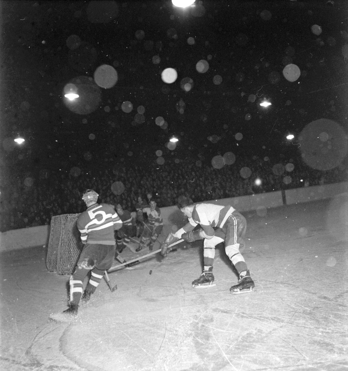 Ishockeymatch GGIK - Canada, februari 1951. GGIK är förkortning för Gävle Godtemplares Idrottsklubb, kallades även för Godis eller Saftpiraterna.