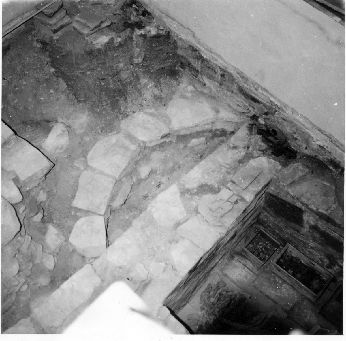 Grundmurar för romanskt kor med anslutande absid. I förgrunden t.h. gravkammaren från barocken