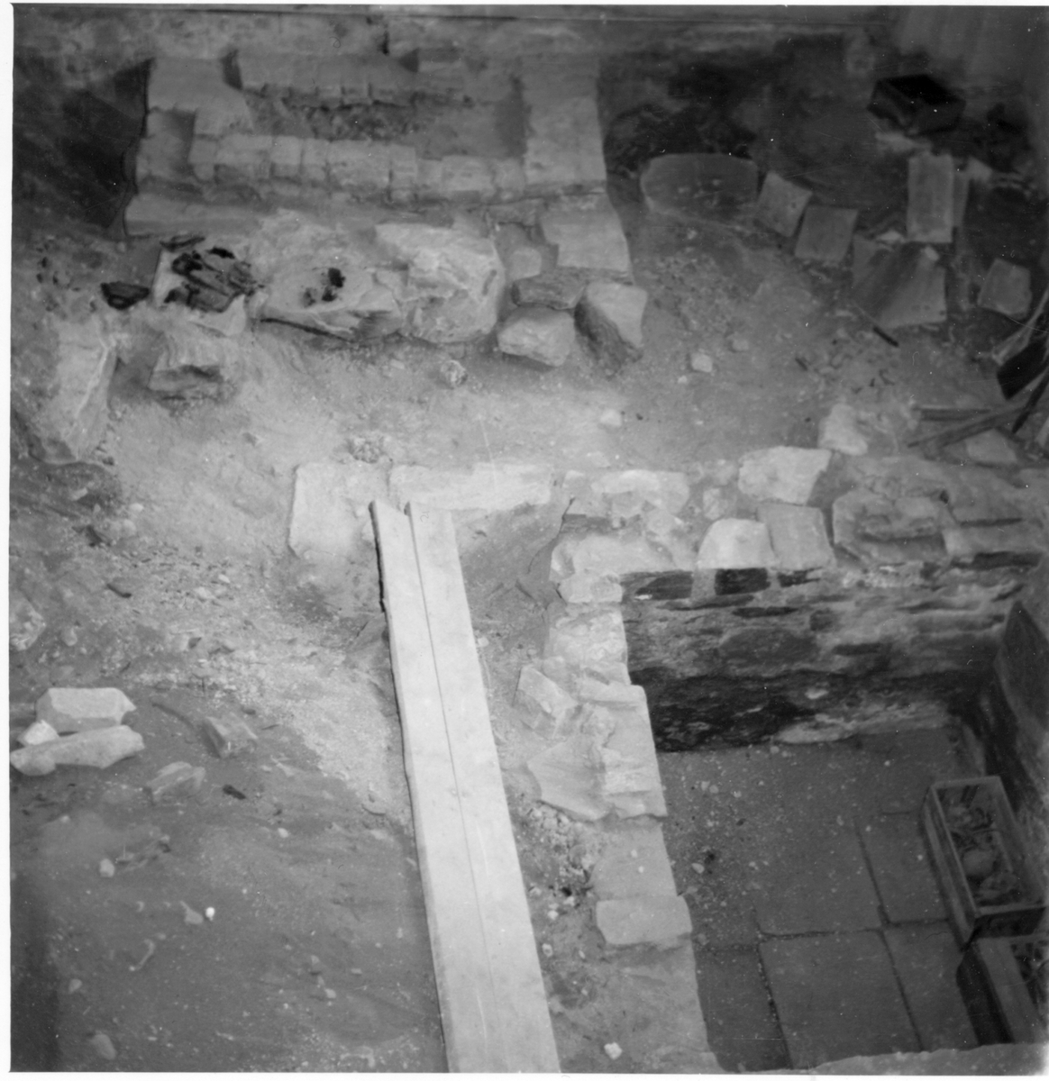 Den senmedeltida altargrunden. Framför denna det romerska korets NÖ hörn. Främt t.h. gravkammare från barocken.