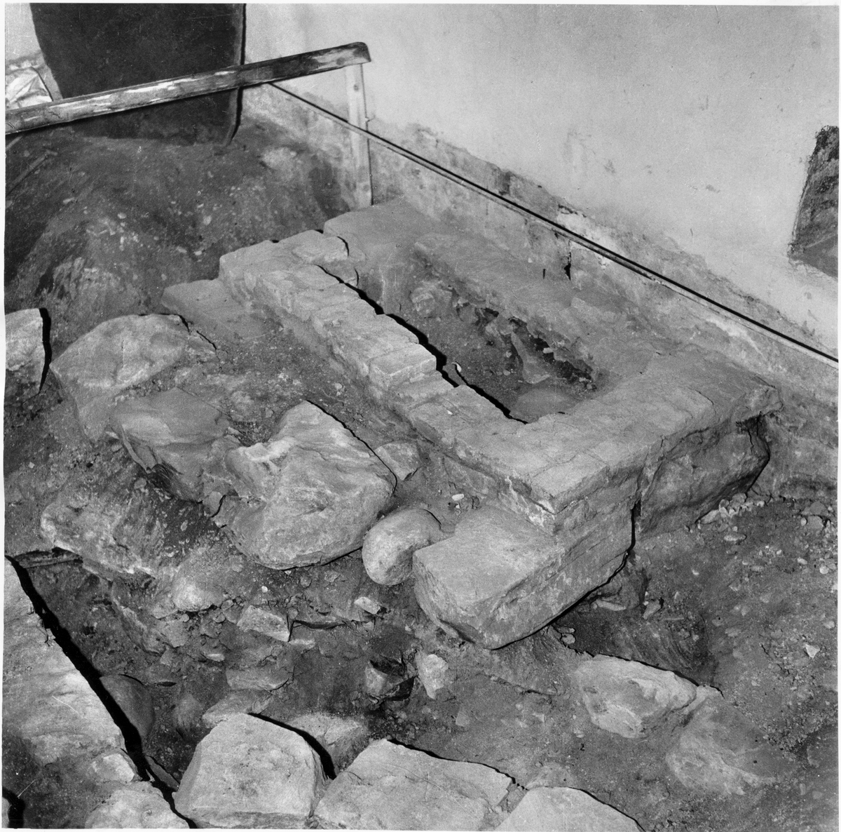 Från 1955 års grävning under korgolvet. I förgrunden den äldsta kyrkans absid och östra kormur. I bildens mitt fundamentet för 1300-talskyrkans högaltare. Bilden tagen från SV.