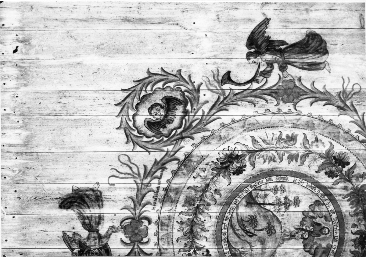 Titel: Hedesunda. Takmålning från Nystugan, Lindåsen. Målat av Hans Wikström. (Allmogemåleri/H. Wikström).