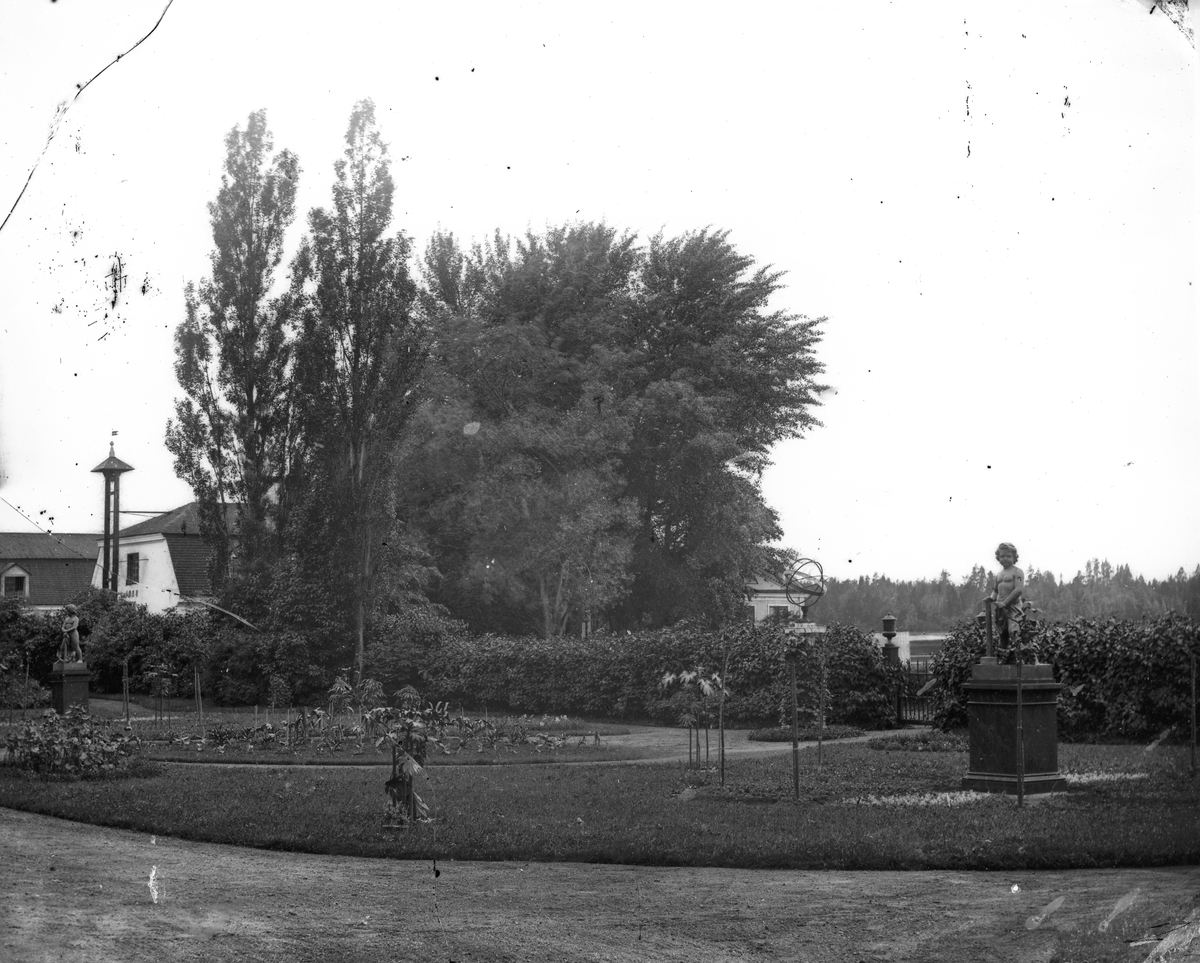 Trädgården framför Gysinge herrgård med magasinen i bakgrunden.