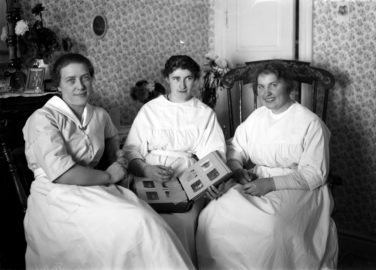Tre unga kvinnor tittar i fotoalbum