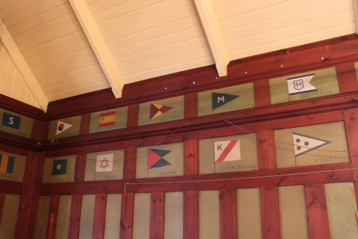 Klubbhuset vid Huseliiharen, samlingssal, igenkänningsflaggor.