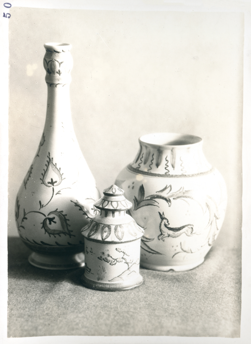 En långsmal vas, en rundad vas samt en burk med lock från Bo Fajans, tidigt 1900-tal.