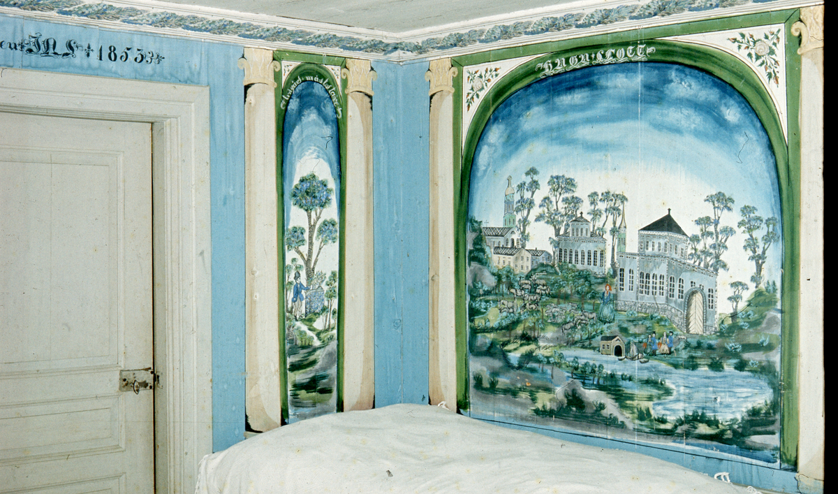 Väggmålningar. T.v. Dörröverstycke med årtal "1853", i mitten av bilden "Trädgård mästare", t.h. "Haga slott".