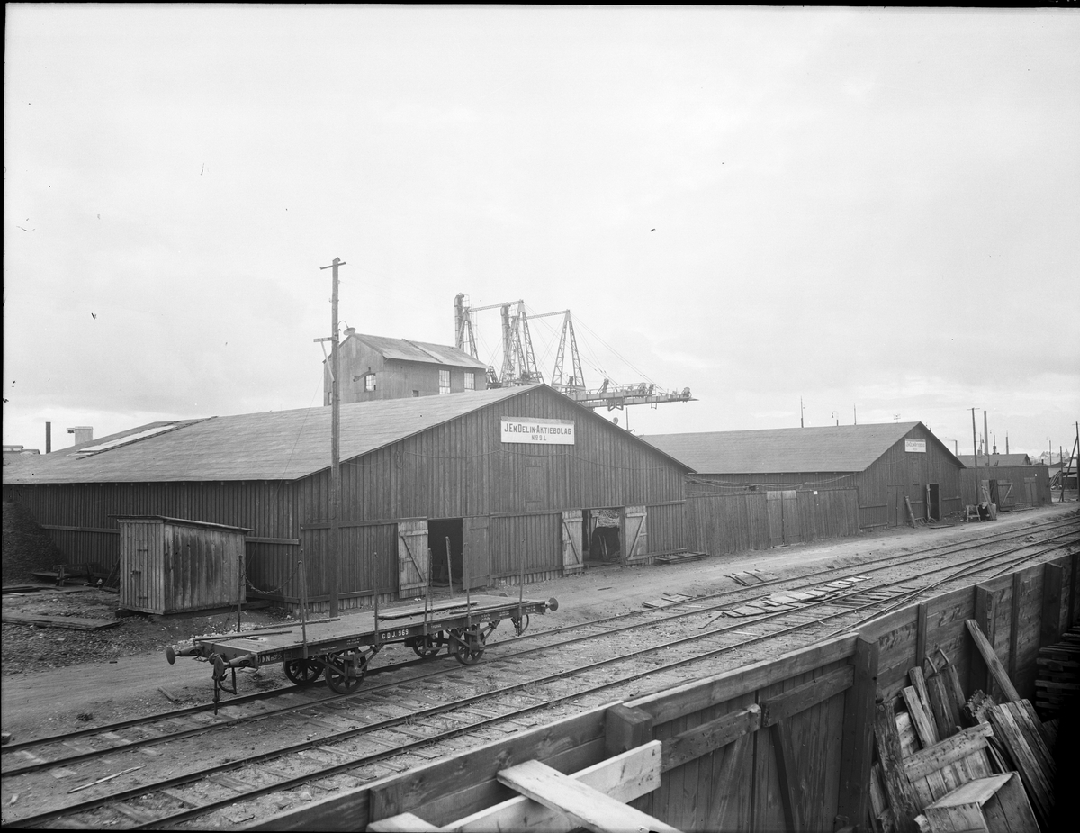 J. Em. Delin AB bedrev handel i Gävle med bla kolimport. Magasinsbyggnaderna vid Houcken. I bakgrunden, kranen "Trötte Teodor".