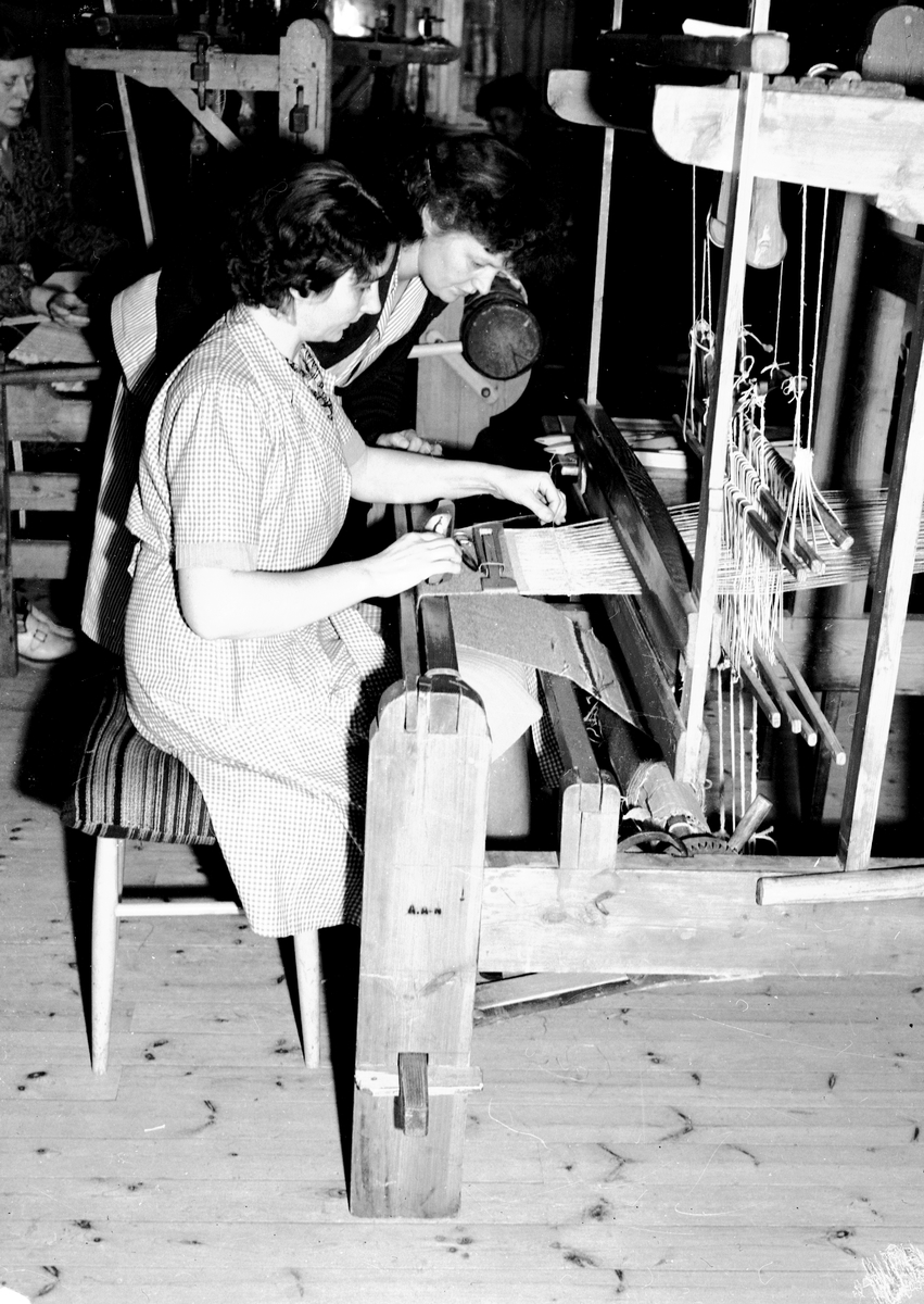 Vävskola i Godtemplarlokalen i Allmänninge, Valbo. 11 oktober 1950. Brita Mårtensson vävlärare från Hälsingland undervisar en elev.