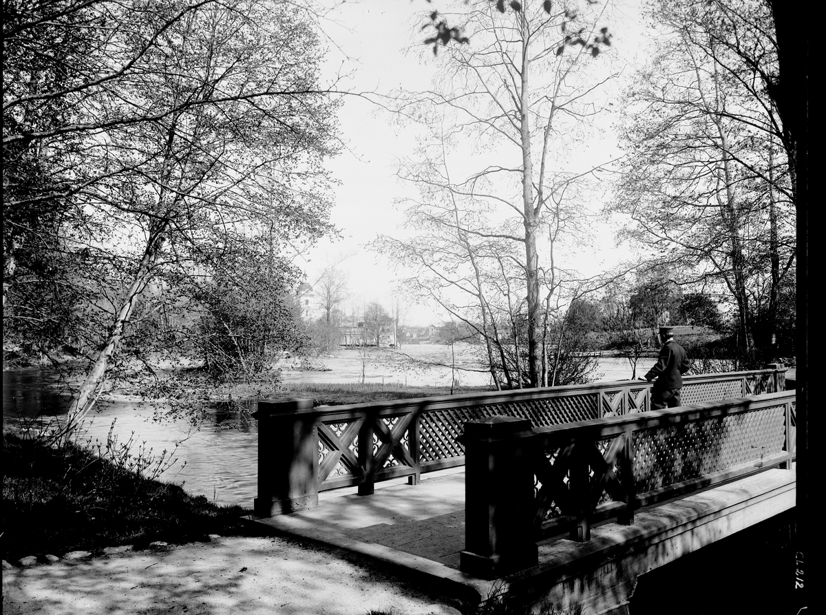 En man beundrar den stadsträdgården, stående på en vacker bro över Gavleån. Trefaldighetskyrkan skymtar bakom trädgrenarna.