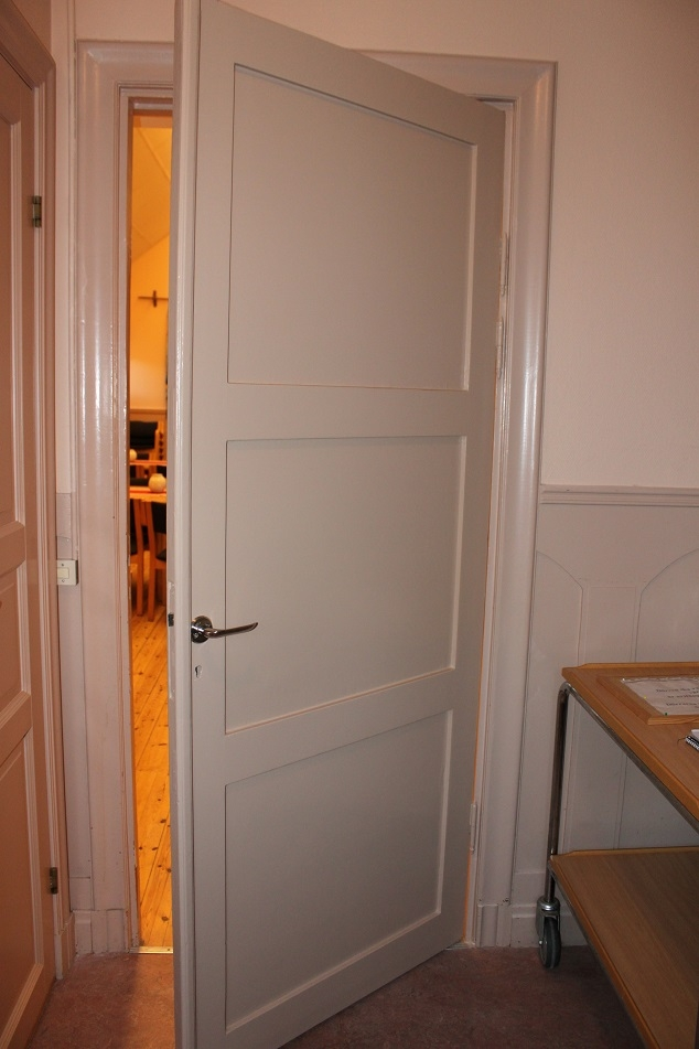 Böna hembygdsgård, dörr mellan samlingssalen och toahallen.