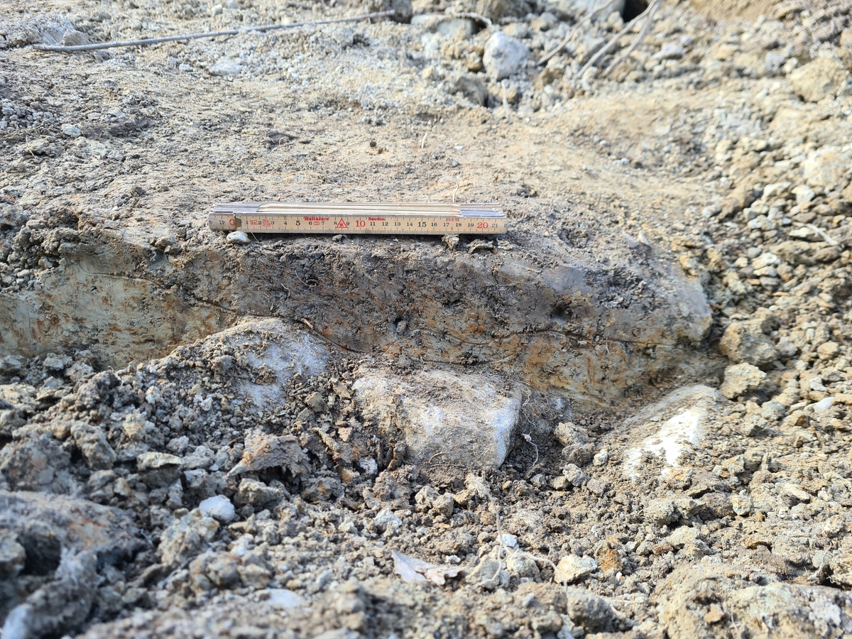 Sektion genom stolphålet AS213, som var flackt med stenskoning i botten. Foto mot väster. Från arkeologisk undersökning i form av schaktningsövervakning i Hede, Hälsingtuna socken, Hudiksvalls kommun.
