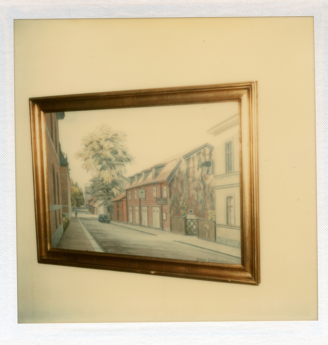 Tavla målad av David Söderholm, med Västerås motiv från spannmålsmagasinet Vasagatan 2. C:a 1975.