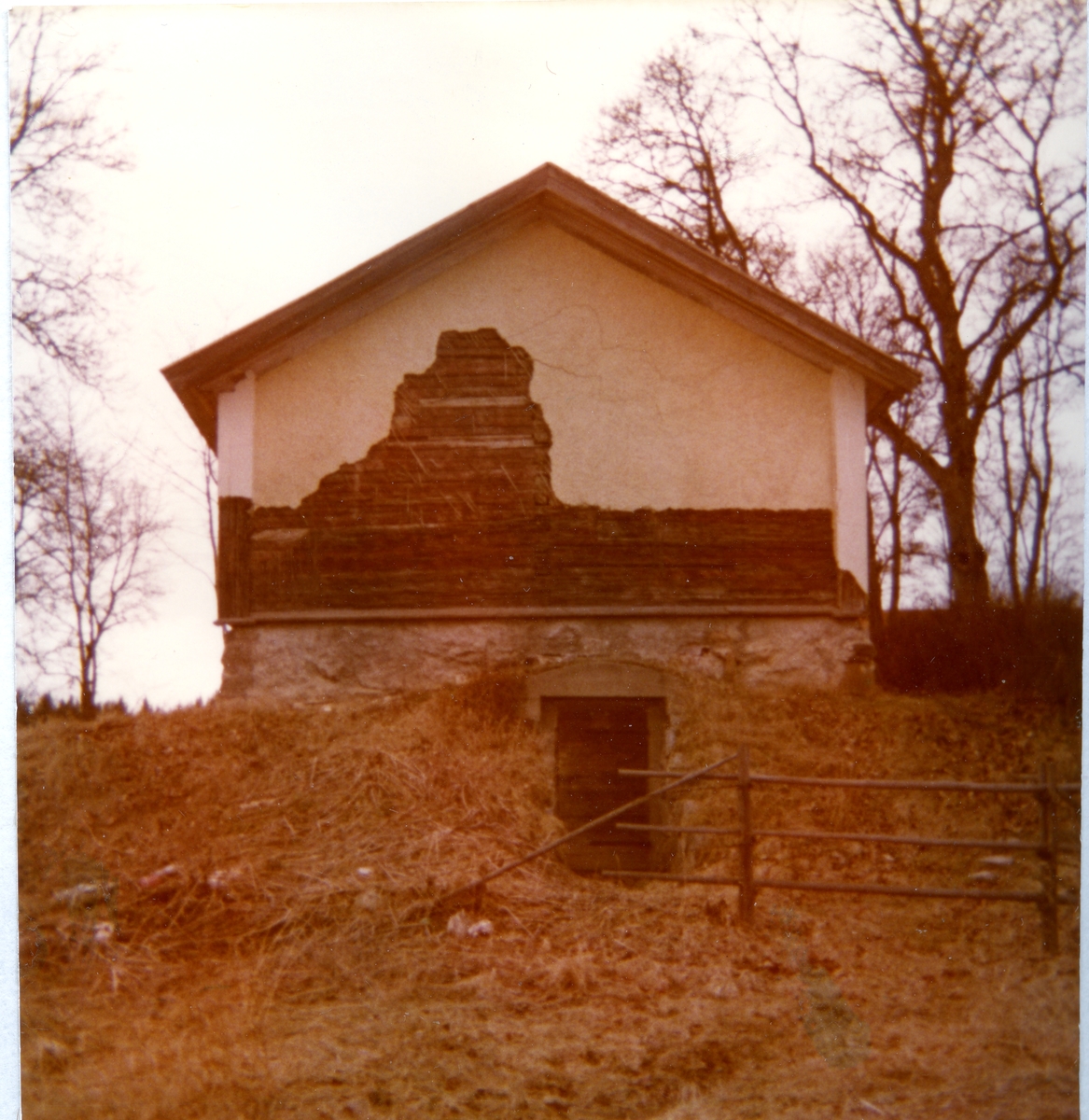 Lillstuga. Södra sidan, med källardörr i stengrunden. 1974.