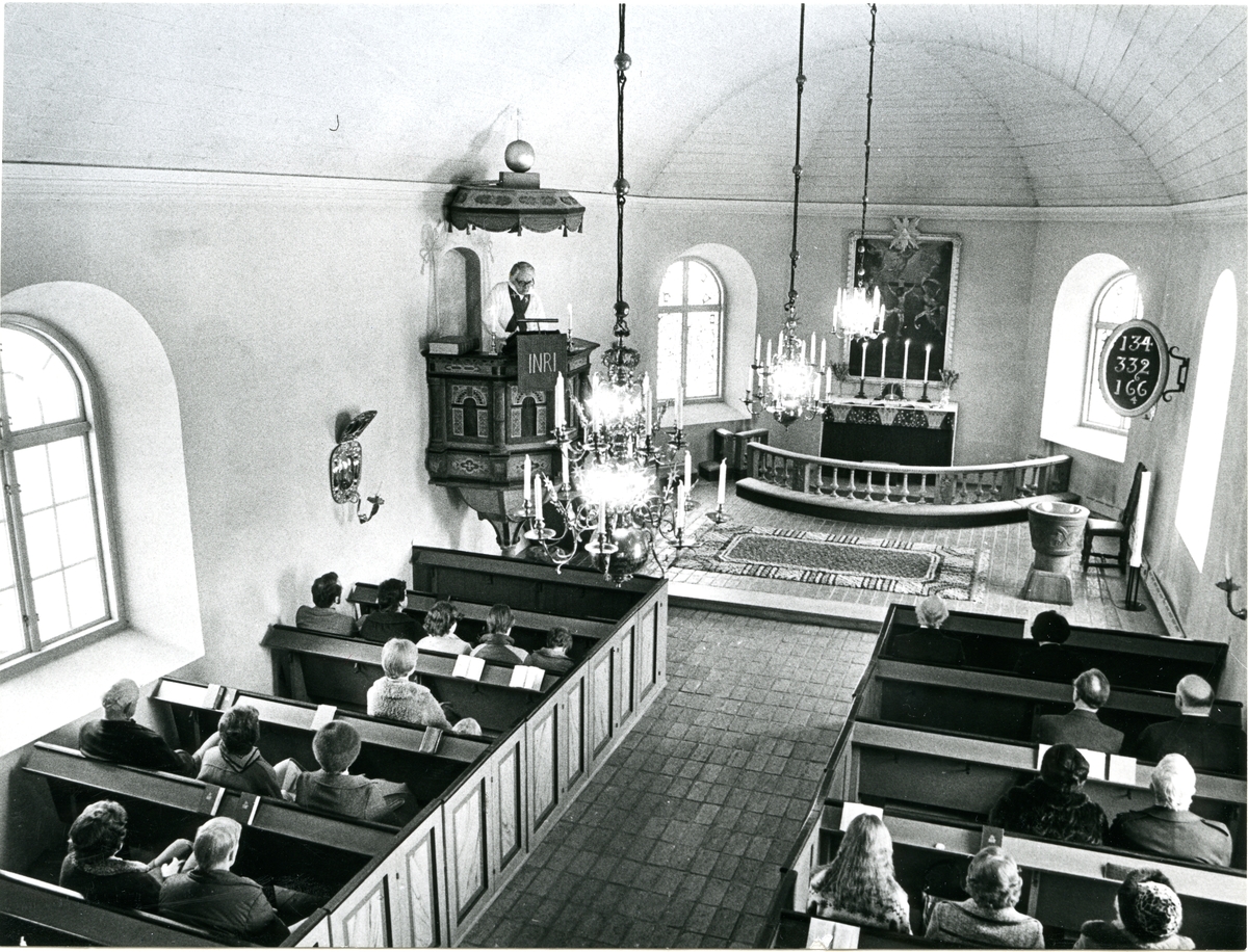 Prästen håller predikan från predikstolen i Lillhärads kyrka.