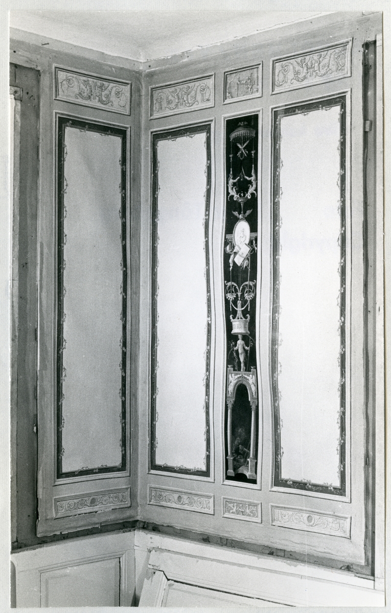 Titel: Arboga sn, Älholmen, (Ellholmen). Herrgården. Interiör. Väggfält med bemålade, ditspikade vävtapeter, före konservering. 1973.